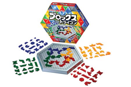 子供から大人まで飽きずに遊べます 友人宅でブロックスをやって以来すっかり気に入りました。ルールは色々な形のピースを辺と辺がぶつからないように置いていくだけの至って簡単な陣地取りゲームですので、すぐに覚えられ、飽きません。大人でも夢中になります。オリジナルのブロックスと違う点は、ゲーム盤が六角形をしていて、角からスタートするのではなく中程の印から始めるところ、3人でもプレイできること、(2人の場合は2色ずつプレイします)、ブロックの形が六角形や、六角形に近い形が含まれているという点です。相手の色にきっちりはまった時は快感ですが、敵を防御するには必ずしもきれいに当てはめた方がいいわけではありません。ブロックは全て小さな三角が組み合わさって台形や六角形が作られているので、子どもが図形の概念を自然に身につけられるという点でも◎だと思います。四角のピースから成るオリジナルのブロックスよりも、抜け道を作りやすく、割としつこく置いていける所が気に入っています。オリジナルとは又別の楽しさがありますのでオリジナルのブロックス愛好家も是非試していただくといいと思います。ブロックスデュオも持っていますが、こちらはすぐに行き詰ってしまいます。トライゴンは、レギュラー版やデュオよりも抜け道を作りやすい為、最もピースを沢山おける可能性が高く、子どもにもお勧めです。真剣にやっても5歳の息子に負けることもあります。
