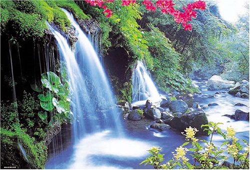 爽やかな美しさ。 流れ落ちる滝の背景のグリーンの木々や草草がさわやかで、すがすがしい美しさに満ちた作品です。花もさりげなくちりばめられ程よいアクセントになっています。決して派手ではありませんが、清涼感あふれる美しい風景写真です。組みやすさは普通程度かやや難しい部類なのではないでしょうか?