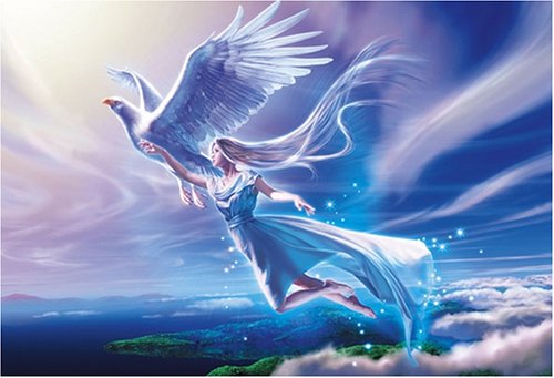 この作品は白鷲が銀髪の美しい女性と共に雲の上まで飛んでいる姿で、女性も白鷲も凛々しい表情をしています。